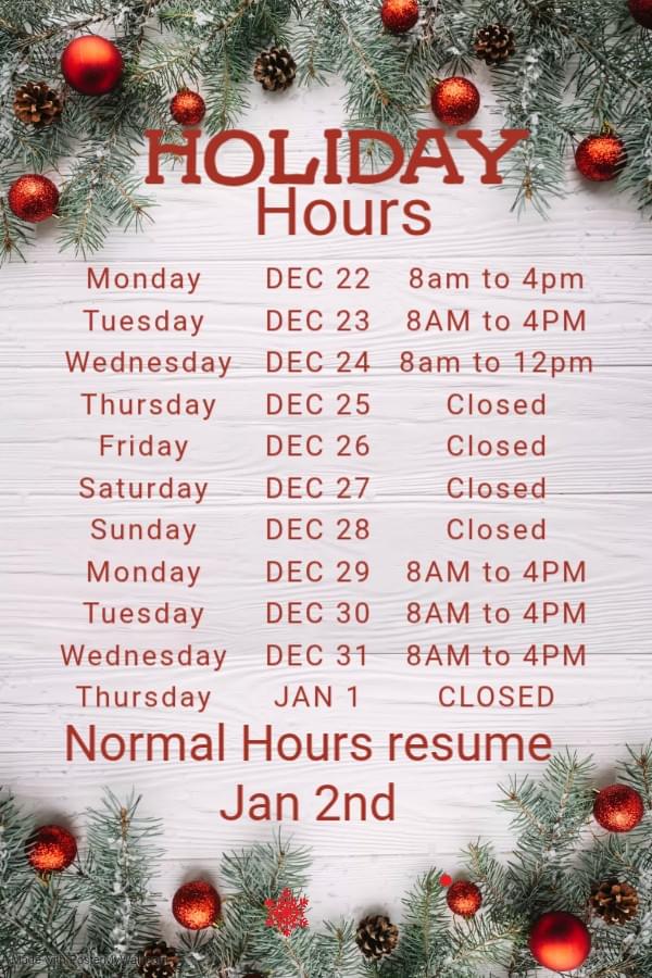 Holiday Hours for the office are listed next to picture of Bruceton Dam.